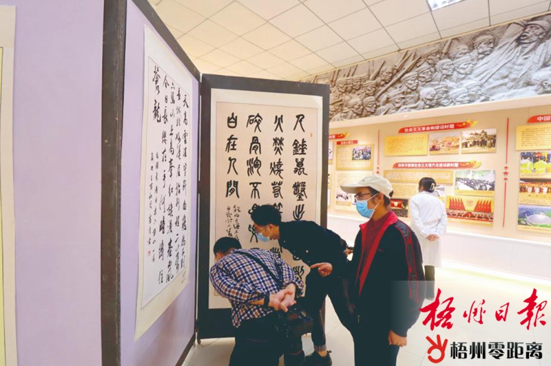 11月13日,在市總工會職工之家展出的2022年“中國夢·勞動美——詩書頌中華 禮贊二十大”梧州市職工書法展吸引市民群眾駐足鑒賞。