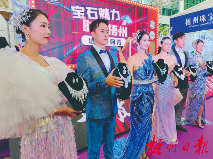 11月25日,“寶石魅力 時尚梧州”達人全網秀中,模特集中展示各式寶石飾品。 記者 何鎏 攝