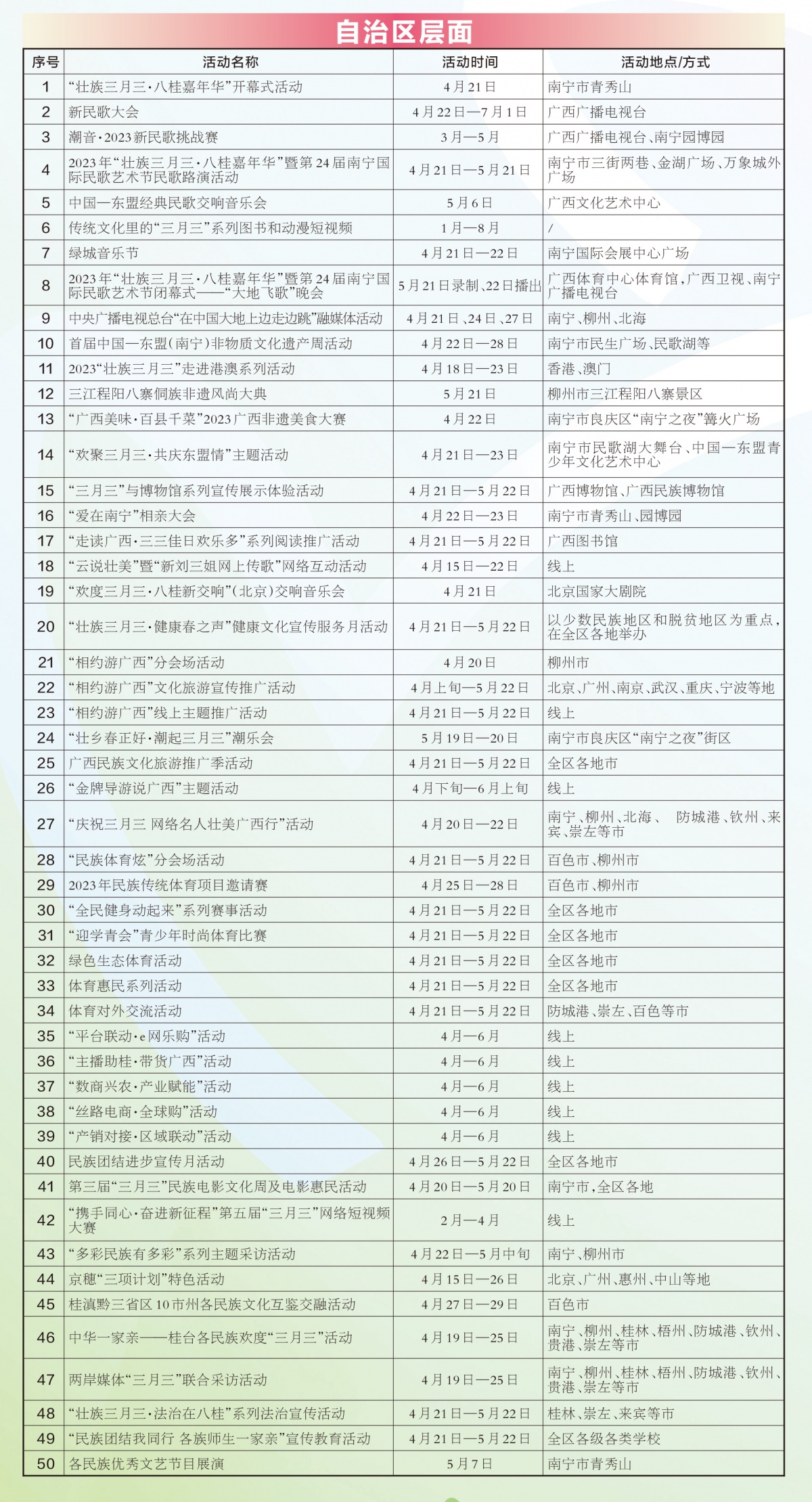 “壯族三月三·八桂嘉年華”文化旅游品牌工作聯(lián)席會(huì)議辦公室精心梳理、遴選300多場(chǎng)有代表性、有特色的活動(dòng)項(xiàng)目在廣西日?qǐng)?bào)等媒體上集中發(fā)布,以便社會(huì)各界廣泛參與,共度八桂嘉年華。更多活動(dòng)資訊敬請(qǐng)關(guān)注各媒體、網(wǎng)站、客戶(hù)端。