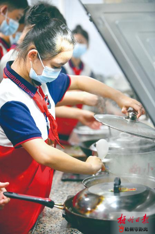 “自去年9月開始,我們每天都安排一個(gè)班的學(xué)生到廚藝傳承勞動(dòng)實(shí)踐基地學(xué)習(xí),把學(xué)生分成9個(gè)小組,模擬9個(gè)小家庭。”南渡小學(xué)常務(wù)副校長(zhǎng)陳安鋒說,老師利用學(xué)校的校本教材,先教會(huì)學(xué)生做飯煮菜的方法和步驟,然后讓學(xué)生模擬家庭勞動(dòng)場(chǎng)景,在基地用自己的行動(dòng)實(shí)踐做飯、煮菜的每個(gè)環(huán)節(jié),既能增強(qiáng)學(xué)生勞動(dòng)素養(yǎng),又能弘揚(yáng)南渡地方美食文化。