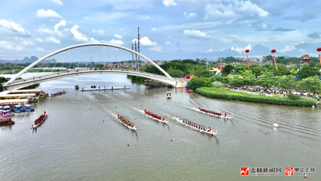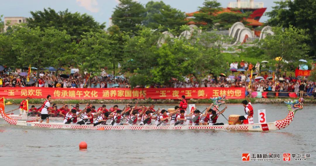 這是2023年玉林市端午文化嘉年華“水韻競渡”龍舟邀請賽的火熱現場。當天17時許,來自廣西區內的12支龍舟隊展開一場精彩的水上較量,共享龍舟競渡的“速度與激情”。