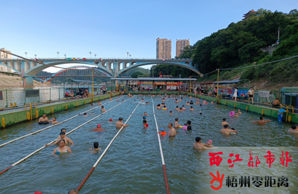 7月8日,人們在位于桂江上的梧州市游泳場暢泳。