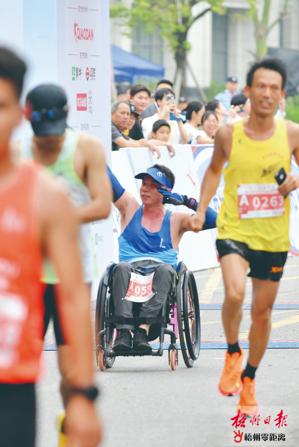 從南寧來梧參賽的廣西輪跑團就是這樣一支坐在輪椅上用雙手“奔跑”的隊伍。八人齊齊用力撥轉輪椅,飛快地奔跑在賽道上。團長何家祥說:“希望能帶動更多殘疾人融入社會,參加戶外運動,一起感受比賽的樂趣。”