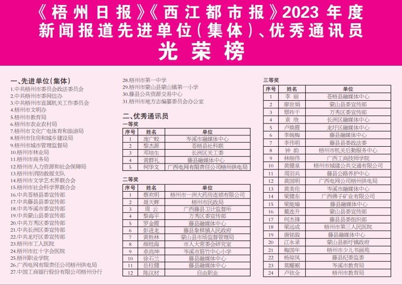 《梧州日報》《西江都市報》2023年度新聞報道先進單位(集體)、優(yōu)秀通訊員光榮榜
