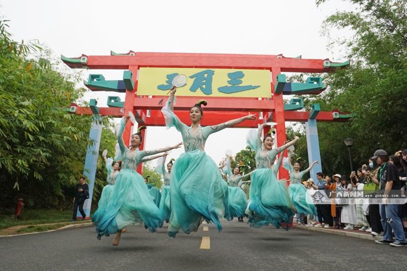 4月11日,在南寧青秀山“廣西三月三·八桂嘉年華”主會場入口處,演員們以熱情洋溢的舞蹈《踏春》歡迎八方賓客。記者 梁凱昌 攝