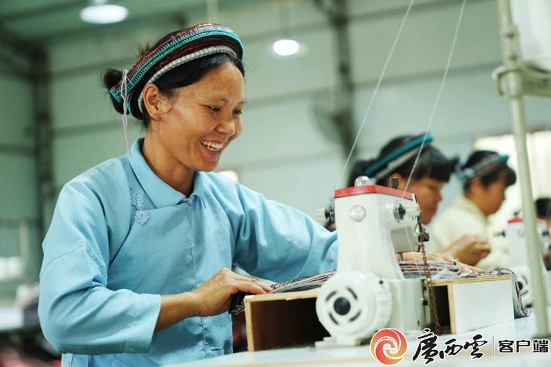 在融水苗族自治縣洞頭鎮(zhèn)洞頭村就業(yè)幫扶工廠,當(dāng)?shù)貗D女正在縫制衣物。地處大苗山深處的洞頭輕紡就業(yè)幫扶車(chē)間吸納了當(dāng)?shù)?00多名婦女就業(yè),讓她們實(shí)現(xiàn)顧家、增收兩不誤。龍濤 攝