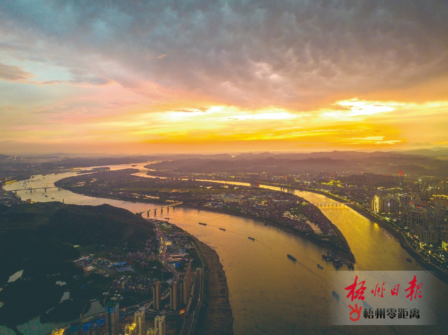 7月21日,西江流過梧州市區(qū),晚霞與城市建筑、江河、貨運船只相映成景,構成一幅黃金水道航運干線上的夏日美景。 何華文 攝