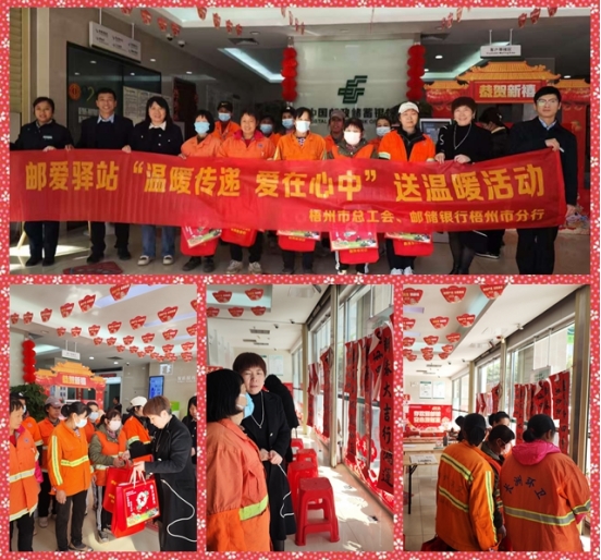 春節將至,為讓廣大戶外勞動者在嚴寒中感受到溫暖與關懷,1月17日,郵儲銀行梧州市分行依托工會驛站在分行營業部開展“溫暖傳遞 愛在心中”送溫暖活動,為堅守在一線的交警和環衛工人送上新春的祝福與慰問。活動現場,工會驛站布置得格外溫馨,洋溢著濃濃的節日氛圍。