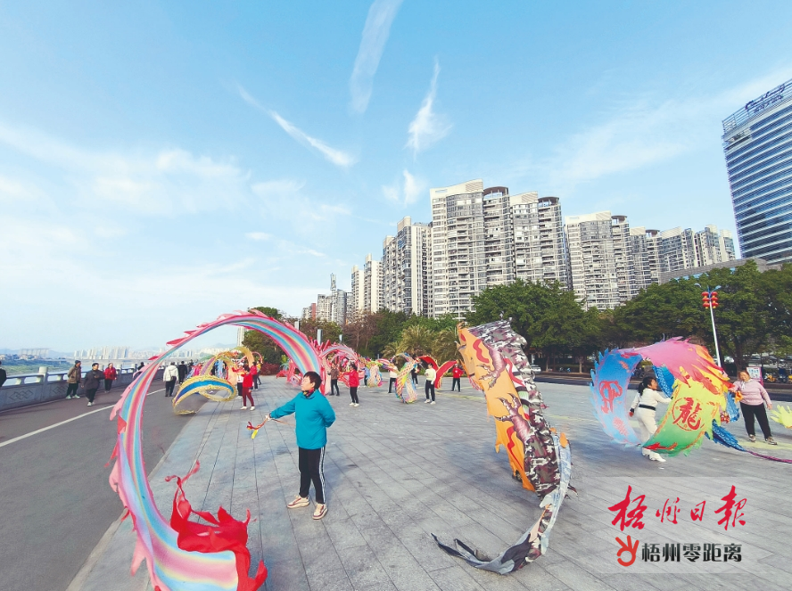 2月24日,在西堤公園,舞龍愛好者正在晨練舞龍健身。 當天天氣晴好,30多名愛好舞龍的市民聚在西堤公園一處小廣場練習舞龍表演,舞龍上下翻飛,吸引了不少晨運健身的群眾駐足觀賞。梧州日報