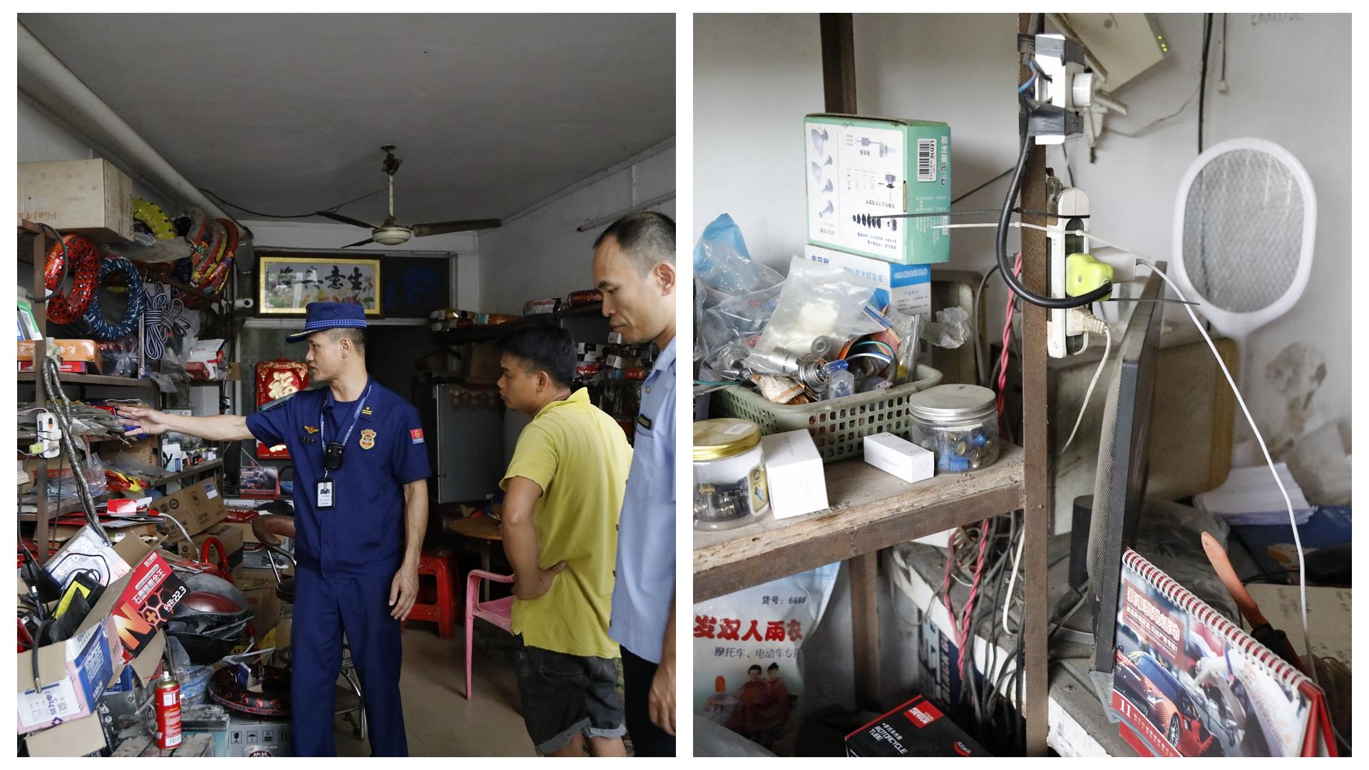 左:檢查人員指出店鋪存在的問(wèn)題。右:室內(nèi)的電氣線路鋪設(shè)不規(guī)范。
