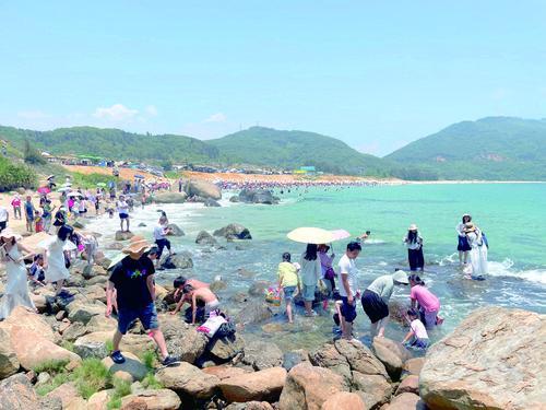 →拾貝殼是海濱游的另一種樂(lè)趣。