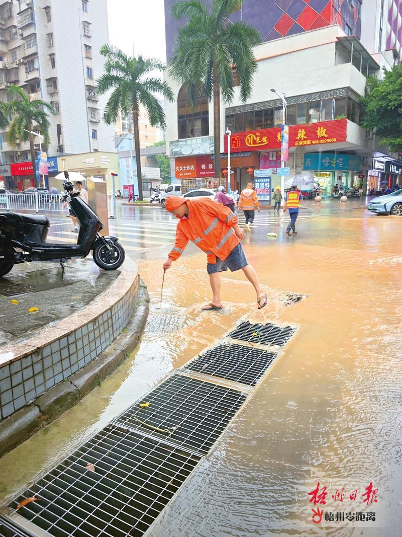 8月4日下午,市政部門(mén)工作人員在新興二路夢(mèng)之島商場(chǎng)附近疏通下水口,確保積水路段排水通暢。梧州日?qǐng)?bào)記者 何鎏 攝