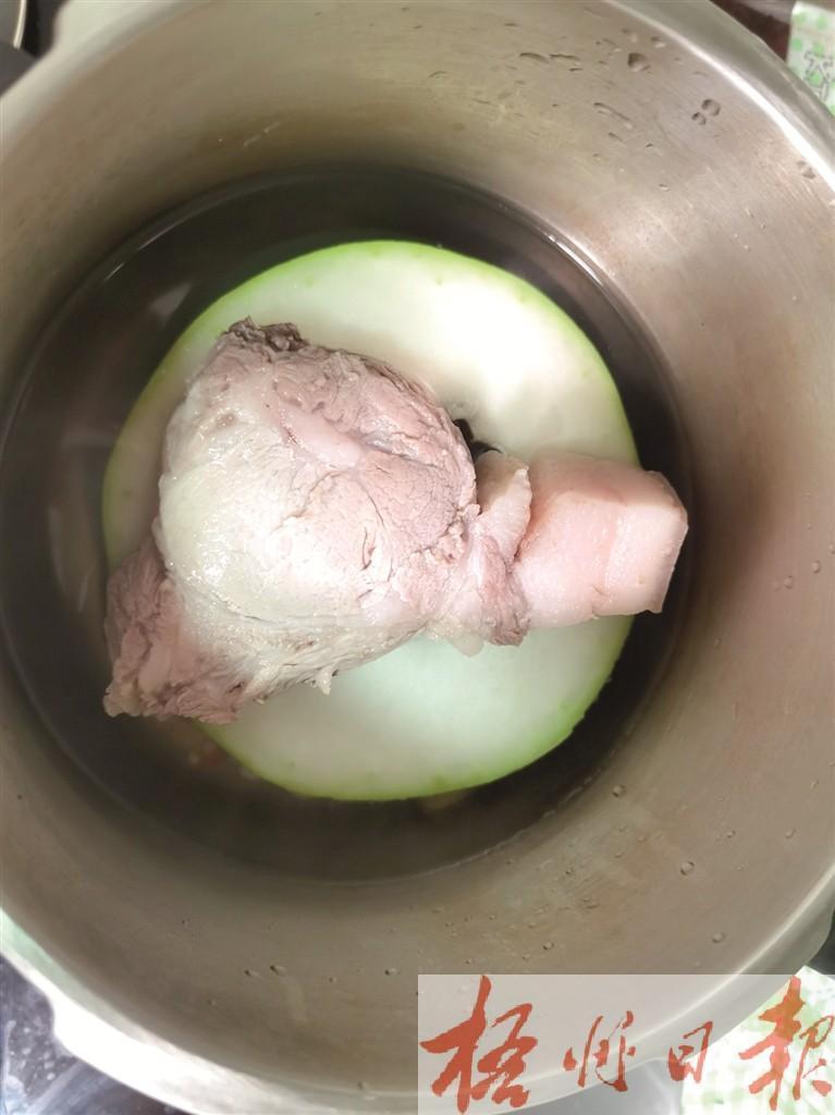 步驟3:把梅花肉、冬瓜放煲里,可以適量放一些芡實(shí)、薏米、扁豆、瑤柱,一起煮40分鐘(也可以用高壓鍋壓15分鐘)。