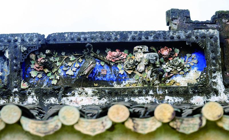 屋脊上泥塑的花鳥紋樣至今保存完整。