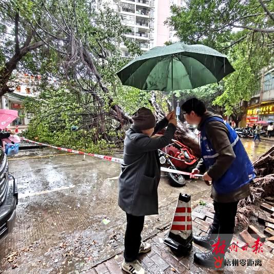 社區(qū)接報后迅速響應(yīng),第一時間安排網(wǎng)格員趕往現(xiàn)場,在相關(guān)區(qū)域周邊拉起警戒線,并疏導(dǎo)過往車輛與行人,嚴(yán)防意外發(fā)生。同時,社區(qū)將相關(guān)情況上報富民街道。街道接報后立即聯(lián)系萬秀區(qū)城鄉(xiāng)建設(shè)和城市管理監(jiān)督局、紫荊花園物業(yè)管理部等部門,各方展開緊急會商,確定砍伐清理方案,確保盡快恢復(fù)道路通行。