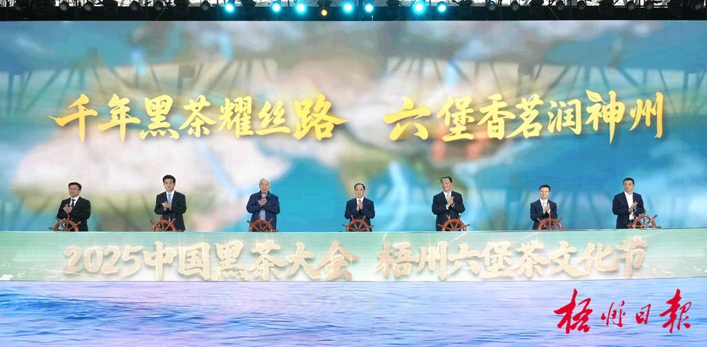 “我宣布,2025中國(guó)黑茶大會(huì)—2025梧州六堡茶文化節(jié)開幕”。隨著許顯輝朗聲宣布,7位領(lǐng)導(dǎo)嘉賓共同轉(zhuǎn)動(dòng)象征“茶船古道揚(yáng)帆遠(yuǎn)航”的船舵裝置,全場(chǎng)響起熱烈掌聲。