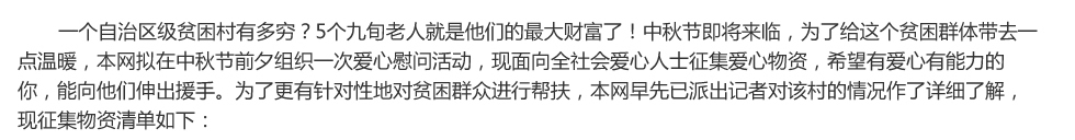 然而,要讓老人們在幸福院里生活得舒適,還需要更多生活用品的配備,比如蚊帳被褥等生活必需品,還有廚具、熱水設(shè)備、電視等家電家具,“為了讓五保戶以及有需要的困難老人盡快入住幸福院,希望社會各界有愛心有能力的人能伸出援手。”董曉軍說。 |