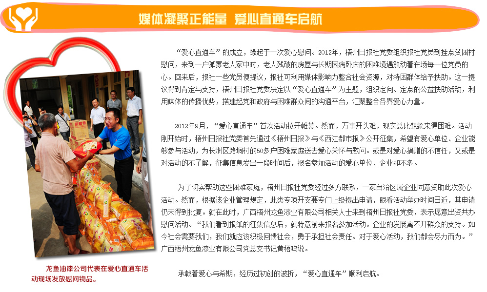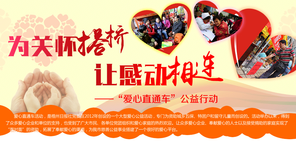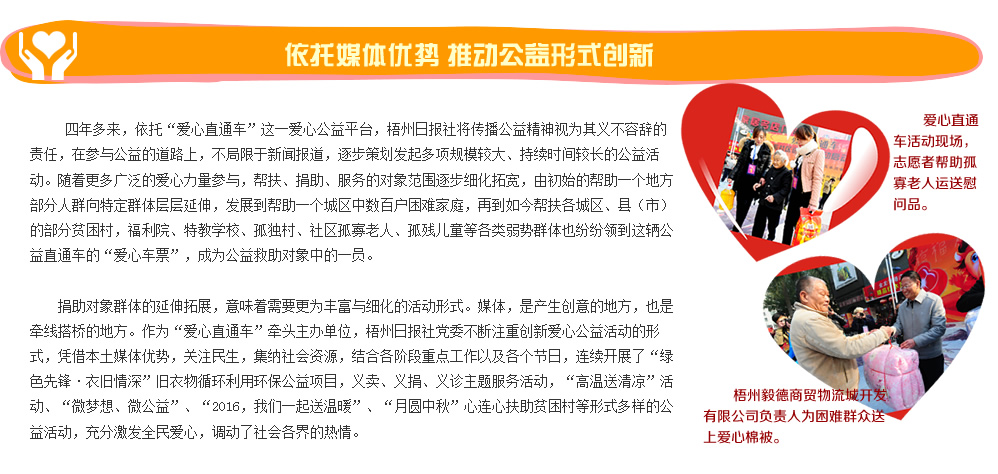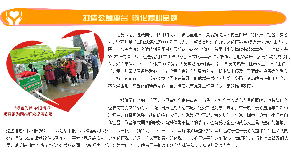| | 點滴愛心帶來春的溫暖 | | 2015年2月12、13日 | | 羊年春節前,由梧州日報社主辦的“愛心直通車”送溫暖活動趕在年前走村進戶,為留守兒童、困難家庭、孤寡老人送去愛心物資,送上力所能及的幫助。 | |  | | 愛心物資資助困難群眾 | | 2015年2月7日 | | “愛心直通車——我們一起送溫暖”之助圓微夢想,送溫暖活動長洲區站在市政廣場隆重舉行。各個愛心單位、愛心企業代表將物資贈送給倒水鎮4個村并對困難家庭進行慰問。 | |  | | 份份牽掛點點愛心溫暖困難群眾 | | 2015年2月6日 | | “愛心直通車——我們一起送溫暖”之“情系村(居)送溫暖”活動萬秀區站啟動儀式在鴛江麗港廣場隆重舉行。儀式啟動后愛心代表帶著愛心物品探訪困難群眾。 | |  | | 問候與祝福傳遞融融暖意 | | 2015年2月6日 | | 2月6日市四家班子領導分頭走訪慰問老黨員、困難黨員、困難勞模、困難職工、五保戶、低保戶、孤兒、優撫對象、復退軍人等,為他們送去黨和政府的真切關懷和新春祝福。 | |